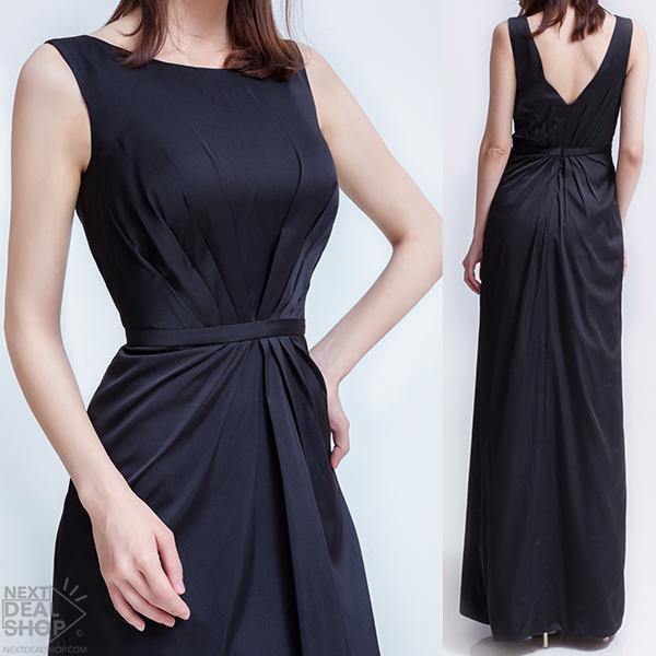 Coloque este longo vestido preto de baile estiloso, porém confortável, feito de tecidos sedosos. O tamanho é justo e sem mangas, com uma gola alta e detalhes na frente e nas costas com as costas abertas.